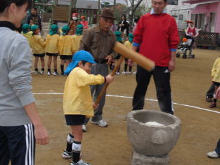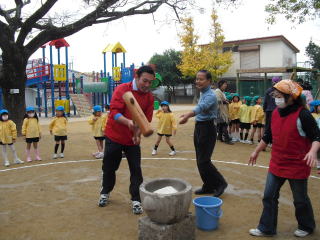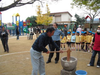 さぁ~杵(きね)をもって お持ちつき開始! 付け水をするのは 園長先生です