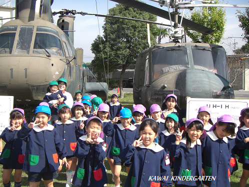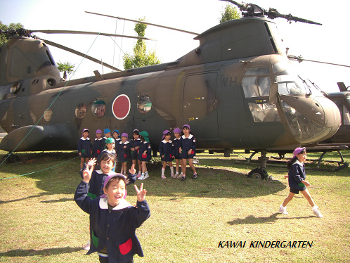 大きなヘリの前で、ピース!